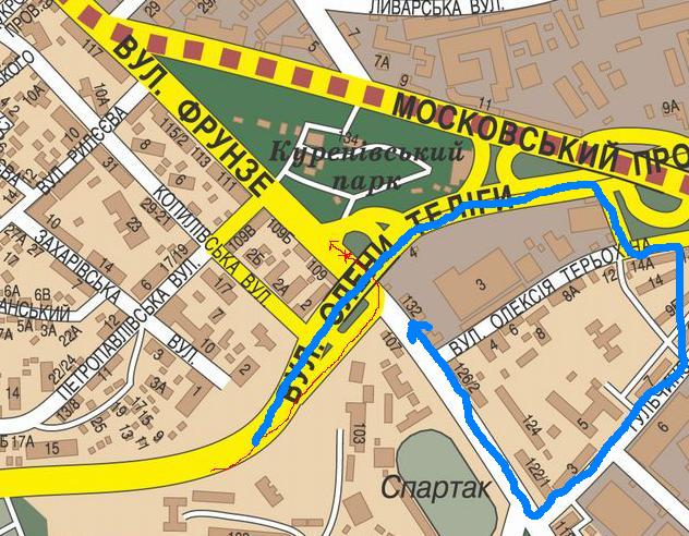 Вот так. Там где я по домам срезал - надо чуть дальше прокатится и сделав два правых поворота выехать на Тульчинскую
