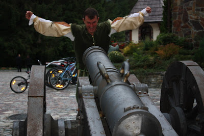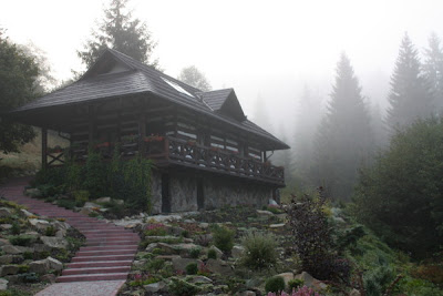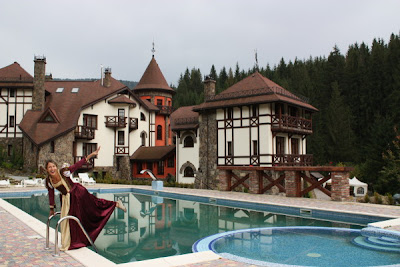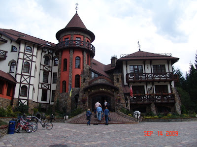 Хорошенько выспавшись, плотно покушав, неспеша стартуем со Львова в горы. Все мы впервые свернули с до боли знакомой дороги Львов-Ужгород в направлении Славское. Почти сразу за поворотом замечаем симпатичный комплекс «Святослав» http://www.sviatoslav.ua заезжаем на кофе. Фотографировать на территории запрещено, если вы захотите просто посмотреть, без кофе – вход 20 грн. На территории есть реальный зоопарк с оленями и прочими животными, очень классные коттеджи на берегу реки, в общем, зачетное место! Далее рулим в горы 25 км по весьма убитой дороге. Ну где же, где же этот замок!? – не терпится мне увидеть «самый яркий отель Украины». И вот поворот, замковые ворота – и он, самый настоящий Замок!