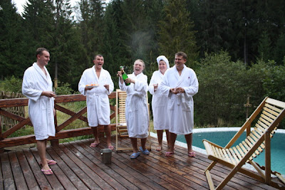 Банька у нас была заказана заранее, к нашему приезду уже все было готово. Очень трогательный сюрприз преподнесла администрация отеля. Именно в этот день был День Варенья одного из участников нашей поездки, отель поздравил шампанским и фруктами прямо в бане, это было так безумно весело и неожиданно!