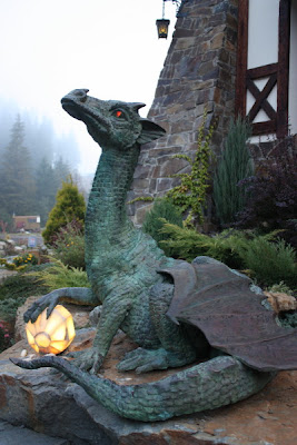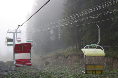 Утром все вокруг окутал белый туман, поглотив горы и наш замок. Перед завтраком прошлись до канатной дороги (именно в день нашего пребывания она не работала, но вообще летом она функционирует).