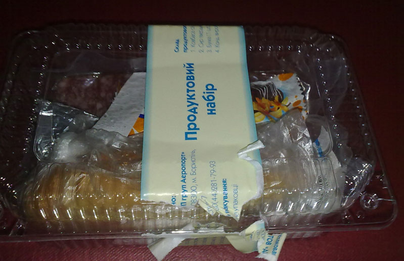 В поезде проводница принесла "продуктовый набор" и сказала, что он включен в стоимость билета. Поинтересовался стоимостью - 35 грн. О составе судите сами (фото) + была еще бутылочка Оболонской газировки 0.5 литра.