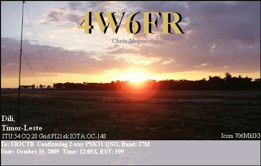 О! Андрей, Спасибо за ПОЗДРАВЛЕНИЯ! Выбил счетчик на eqsl.cc и у меня 100 "ентриейсов". Выложу свою статистику на eqsl.cc Первые ещсл пришли 2002 February Последняя, сегодня) 100 страна 2009 October Bands 2m 50 10M 68 12M 15 15M 127 17M 41 20M 262 30M 9 40M 19 80M 19 160M 1 70cm 15 Modes CW 7 FM 45 FSK441 6 HELL 5 MFSK 3 MFSK16 26 MT63 2 PKT 1 PSK 3 PSK125 1 PSK3 5 PSK31 366 RTTY 94 SSB 60 SSTV 1 TOR 1 Propagation Modes ES 1 MS 1 SAT 19 Всего за 7 лет получено Entire InBox 626 qsl / из них 100DXCC