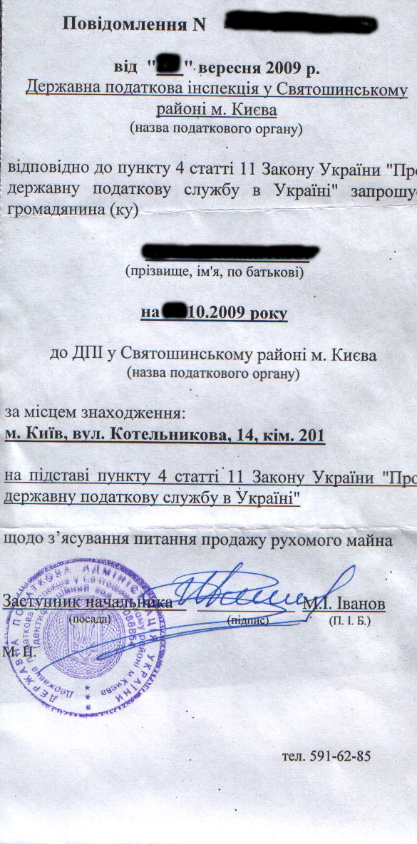 Честно говоря, собираюсь забить на эту писульку, хотя бы потому что пункт статьи, на который идет ссылка в письме, гласит: "Стаття 11. Права органів державної податкової служби 4) запрошувати платників податків або їх представників для перевірки правильності нарахування та своєчасності сплати податків та зборів (обов'язкових платежів) такими платниками податків. Письмові повідомлення про такі запрошення направляються не пізніше ніж за десять робочих днів до дня запрошення РЕКОМЕНДОВАНИМИ ЛИСТАМИ , в яких зазначаються підстави запрошення, дата і час, на які запрошується платник податків (посадова особа платника податків)", а я нашел своё "письмо счастья" просто в почтовом ящике.