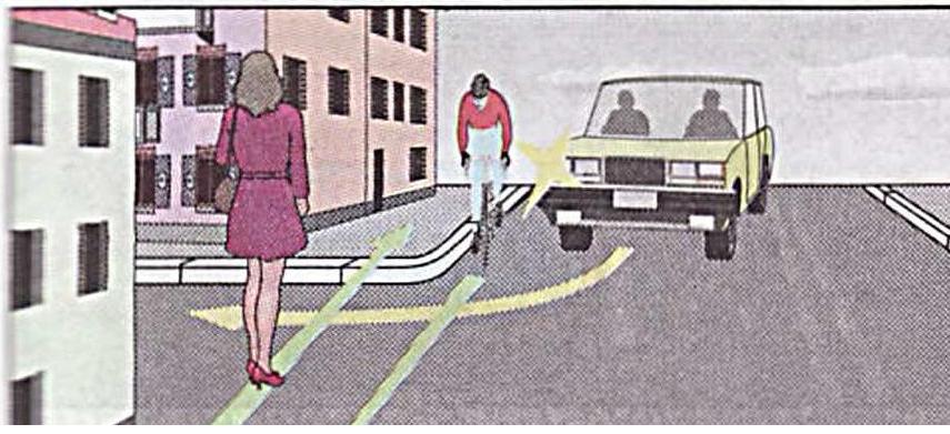 Касательно велосипедиста (местного) - он может двигаться со скоростью, превышающую твою, слегка сзади от тебя и справа, вжимать его никто не собирается - но учитывать его возможное наличие всегда надо.