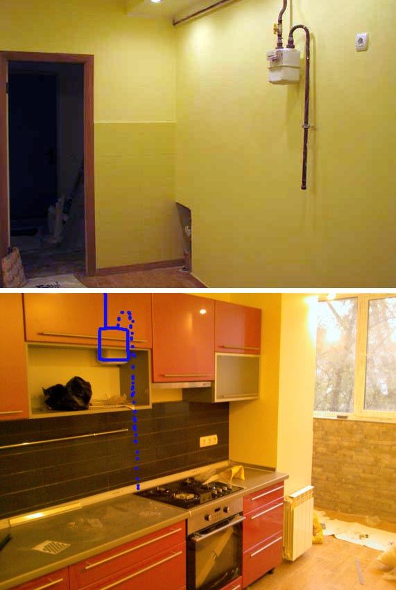 Просто всунули его можно сказать туда намертво (обведено синим на картинке, к не съемной перегородке по середине крепится стеклянная дверка), по линии пунктира к плите думаю опустится гибким шлангом.