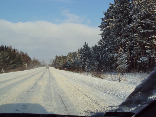 От Ковеля до Киева опять снег. Тем не менее, благодоря практически полному отсутствию транспорта и населенных пунктов, удается держать скорость 80-100 км.ч. Никаких перекрытий, стройтехники замечено не было. О ремонте напомнила только грустная группка дорожных рабочих, бредущих под снегом из ниоткуда в никуда (кругом лес на много километров и никаких следов стройтехники) и хорошо обозначенные знаками проблемные места (всего штуки три). О качестве покрытия судить сложно, т.к. на дороге толстый слой более - менне утрамбованного снега. В Киеве были в начале восьмого вечера. девять с хвостиком часов от Замоща до Киева, учитывая непредвиденную задержку на таможне и погодные условия - думаю нормально для первого раза.
