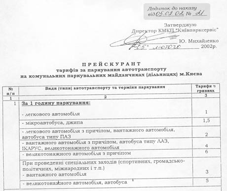 Нету в КМДА N9a упоминания о 83 коп. в час за услуги. Нету, и все И нигде нету. По крайней мере, я так и не нашел. А вырезку из тарифов киевпарксервиса, которые мне дали в офисе, приаттачиваю (заметь, печати нету)... Кстати, 50К - слишком жесткое ограничение на размер файла... Нереально в приличном качестве запихнуть сюда что-нибудь полезное формата А4.