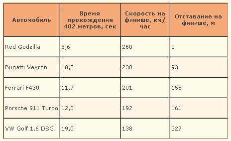 Жека, ты ей богу, как ребенок малый. Того же Филина эвик эту Годзиллу натянет, ибо едет не 8.6, а 8. Но при этом что годзилла, что филинский эвик - это драгстеры! Единственной целью этих авто является ударный разгон на протяжении 402 метров! Вполне возможно, что через 1402 метра у него наx оторвет турбину, а через 3 тыс метров поотваливаются колеса. Не для того их строят, понимаешь? Вейрон же способен ехать со скоростью 400+км/ч более, чем 15 минут. При этом остановится он не от того, что у него турбины поотлетают, а от того, что бензин закончится. И это чудо, о котором пишет топикстартер, разорвет любой драгстер не то, что на нюрбургринге или чайке, а прямо на проспекте победы, потому что у него тормоза работают без использования парашюта