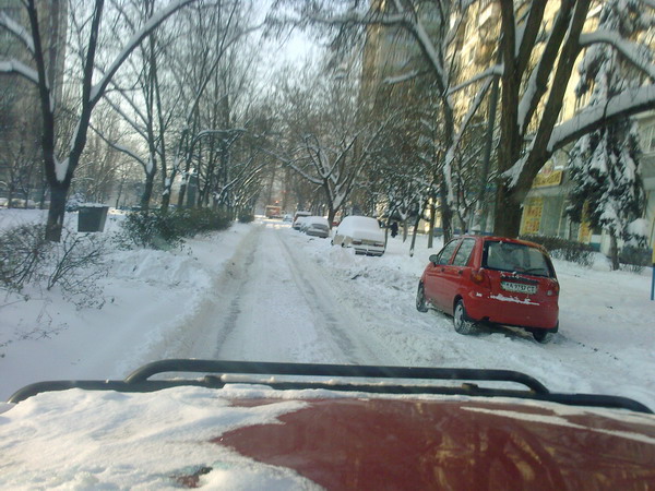 Утром около 9 выехал с Русановки, выезд пустой На мосту Патона тянучка была, причина - что-то стояло во втором ряду. После этого до Соломенки вообще без проблем, удивился даже. Город полупустой, народ не повыезжал... Мелкие улицы не почищены. Фото с Русановского бульвара (уже во второй половине дня), видно, что снег между колеями разравнивался днищами машин...
