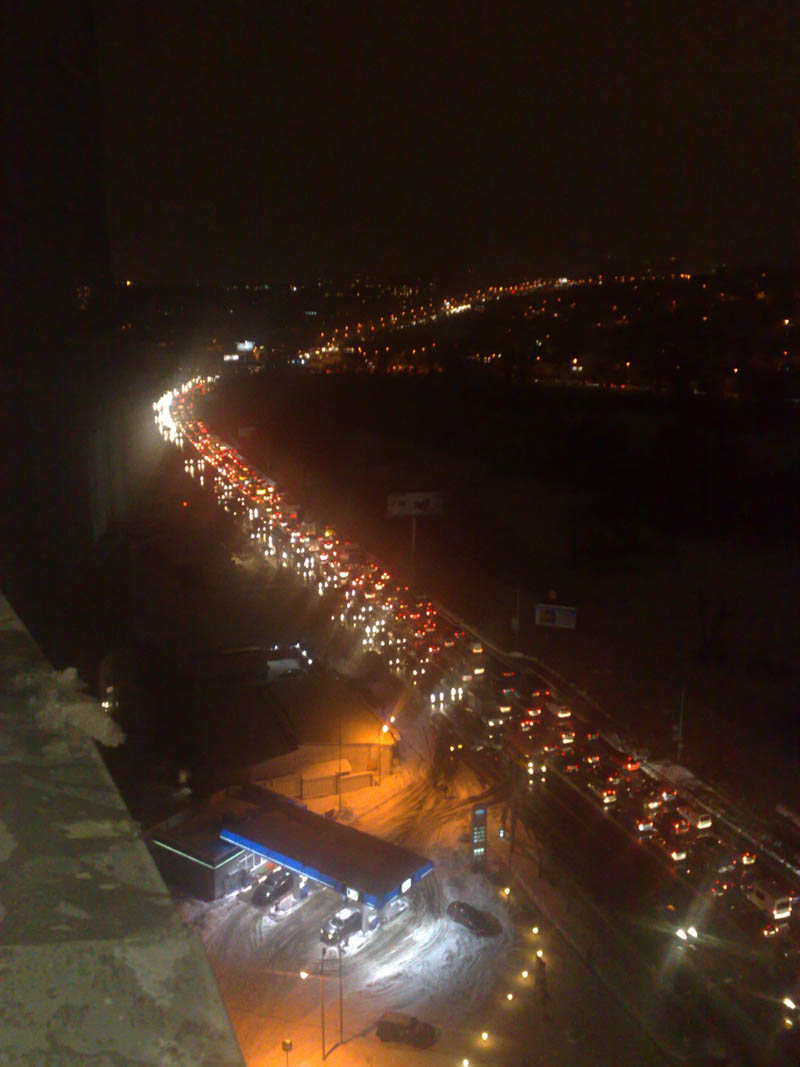 в правильном направлении там не движутся) там реально вафли. полные огромные вафли. пробка растянулась уже почти до 2-х теремков. Все улочки стоят. я ехал через васильковскую - кайсарова - краснозвездный. так до кайсарова не доехал ваще. проскочил через демеевскую. причем там тоже огромная тянучка, но по правой стороне почемуто никто ен едет. снеголед, да.. но вполне прилично ехать можно.. даже без бугров(у меня профиль 40). в общем выскочил на краснозвездный и уперся в эту же пробку опять. кое как проскочил.. но стояк был полный. такой что даже машин едущих по встречному направлению я насчитал аж 4 штуки за все время.
