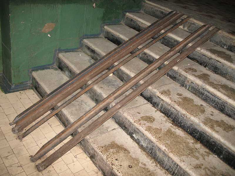 Конструкция самодельных рельс, для спуска коляски. Делались жильцами по мере того, как появлялись разные коляски, с разным межколесным расстоянием - потому так много всего Нижнее крепление