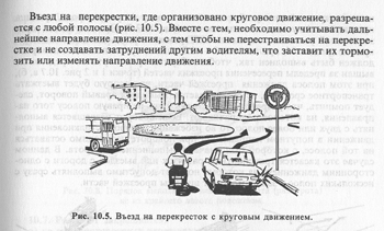 "4.10 "Круговое движение". Требует объезда клумбы (центрального островка) в направлении, показанном стрелками на перекретке с круговым движением.