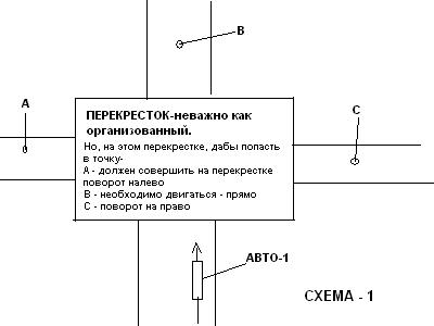 Когда ты подъезжаешь к любому перекрестку, как авто-1 (СХЕМА-1 - прикрепленные файлы), не важно как этот перекресток организован, но если ты желаешь попасть в точку-А - должен совершить на перекрестке поворот налево, желаешь попасть в точку В необходимо двигаться - прямо, ну а если необходимо оказаться в точке С - тогда уж надо выполнить поворот на право.