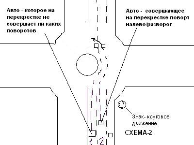 Итак, пока не понятно к какому перекрестку подъезжаем допусти - ты на авто-2, а я на авто-1 (до перекрестка - ты едешь в средней полосе, я в левой)( схема-2). Но тебе, необходимо на перекрестке совершить поворот налево, а я вообще-то прямо собираюсь ехать, и куда тебе надо, меня как-то мало интересует.