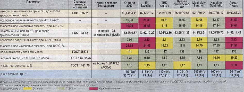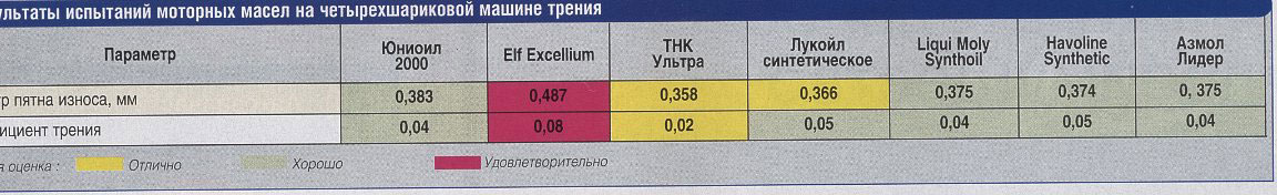 Почитайте в том же номере внимательно статейку про мадам Гуцал (с.26) и многое станет понятно. Масла в статье можно разделить на импортные и отечественные. А импортные бывают дорогие и хорошие (LM), дешевые так себе (Texaco) и плохие (Elf) . Я не понял, кстати, они трибологию проводили до термоокисления или после? Если после, тогда это многое проясняет. Я проехал на Elf 80тк и пока никаких проблем не испытывал - двигатель как новый (компрессия, ужер и все такое). Вот только последняя купленная мною осенью канистра Elf явно отличалась темным цветом от всего того, что покупалось ранее. Слыхал что Евросоюз обязал своих производителей добавлять в новое масло очищенную отработку в количестве около 10% - для утилизации, поэтому свежепроизведенные масла Mobil, Castrol ... отличаются темным цветом (сам сравнивал) .