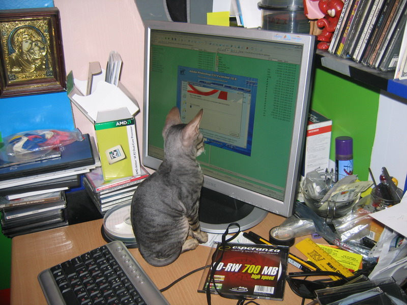 Snowbella дрихне на теліку. тепло там і мала її дістать неможе тєлік не дивиться, а от до компутєра чіпляється, намагається щось там зловить на екрані....... або уважно дивиться коли я в футбол гамаю........