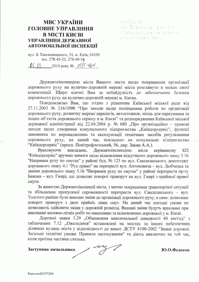 ну і відправив в ДАІ ще пару листів: ************************** Начальнику УДАI ГУМВС України в м.Києві вул.Хмельницького, 54, м.Київ, 01030 Звернення. Повідомляю вам про деякі виявлені недоліки в забезпеченні безпеки дорожнього руху в м. Києві, зокрема: 1. По вул. Саксаганського в напрямку пл. Перемоги перед перехрестям з вул. Толстого нанесена дорожня розмітка 1.18 «Рух по смугам», що дозволяє повертати ліворуч лише з крайньої лівої смуги, тоді як в цьому ж місці встановлено дорожні знаки 5.18 «Рух по смугам», що дозволяють поворот ліворуч з двох лівих смуг ; 2. По вул. Саксаганського в напрямку пл. Перемоги поруч з будинком №123 встановлено дорожні знаки 5.18 «Рух по смугам», що дозволяють поворот ліворуч лише з крайньої лівої смуги, тоді як через близько 100 м на найближчому перехресті з вул. Комінтерна встановлено дорожні знаки 5.18 «Рух по смугам», що дозволяють поворот ліворуч з двох лівих смуг. Це викликає зайві перестроювання автомобілів, що збираються повернути на вул. Комінтерна ліворуч. 3. По пр. Бажана в напрямку м. Бориспільська за близько 100 м до повороту на вул. Гмирі встановлено дорожній знак 5.16 «Напрямки руху по смугам», що дозволяє рухатися лише прямо по всіх смугах, тоді як безпосередньо на повороті на вул. Гмирі встановлено знак 4.9 «Об’їзд перешкоди з лівого або правого боку», що цим самим дозволяє поворот праворуч на вул. Гмирі; 4. По вул. Антоновича на перехресті з вул. Панаса Любченка в бік пл. Либідської встановлено знаки, що суперечать один одному, зокрема: знаки 4.1 «Рух прямо» та 5.18 «Рух по смугам», що дозволяє поворот ліворуч з крайнього лівого ряду. 5. На Московському та Південному мостах в бік правого берега р. Дніпро встановлено знаки 3.29 «Обмеження максимальної швидкості 40 км/год» без знаку 1.37 «Дорожні роботи», що є порушенням вимог п. 12.10 ПДР. Прошу вас перевірити вказані недоліки в забезпеченні безпеки дорожнього руху та, у разі їх підтвердження, встановити відповідальних осіб і видати припис на усунення недоліків та накласти на відповідальних осіб в сфері забезпечення дорожнього руху адміністративне стягнення згідно чинного законодавства. Про вжиті заходи прошу повідомити мене у визначений законодавством термін. ********************* Начальнику УДАI ГУМВС України в Київськiй областi вул.Ф.Ернста, 3, м.Київ, 03153