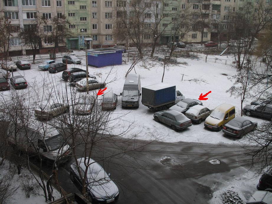 У нас 4 москвича в ряд,+одна вольво уже лет 6 стоят,стоял еще запор прямо под подьездом 3 года,так его когда асфальт ложили оттянули))... 5 мест с 10 занято,канешно люди паркуються на газонах,тротуарах и т.п. Сам свою тоже так ставлю,а шо делать