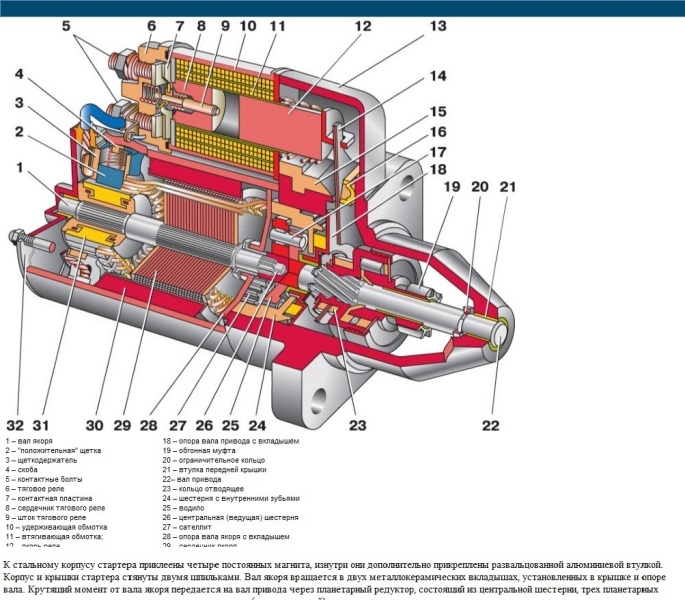 К стальному корпусу стартера приклеены четыре постоянных магнита, изнутри они дополнительно прикреплены развальцованной алюминиевой втулкой. Корпус и крышки стартера стянуты двумя шпильками. Вал якоря вращается в двух металлокерамических вкладышах, установленных в крышке и опоре вала. Крутящий момент от вала якоря передается на вал привода через планетарный редуктор, состоящий из центральной шестерни, трех планетарных шестерен, водила и шестерни с внутренним зацеплением (эпициклической).