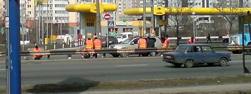 Сколько же его можно красить, они же ещё на той неделе начали… Видел свежекрашенные кистью части в субботу, а в воскресенье наблюдал покраску распылением. Впрочем, работать работнички не особо спешили (это фотка бригады, которая зачищала отбойник под покраску, но разницы в рабоспособности нет)…