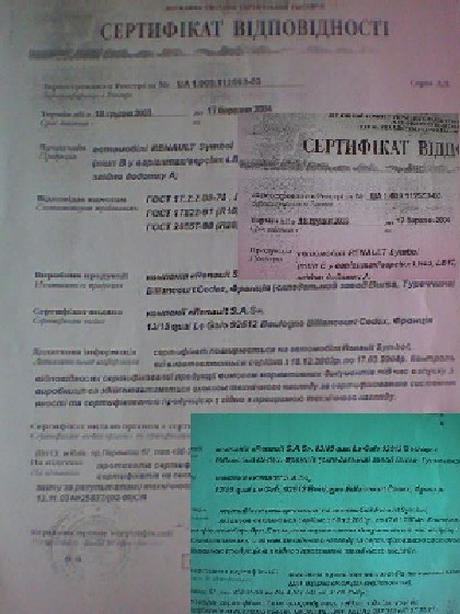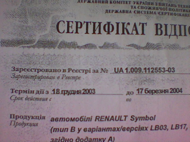 Есть еще сертификат производителя, но его интерестно получать при постоянном и довольно большом объеме продаж. Видимо Рено симбол, не популярная машина в Украине, и выгодней получать разовые сертификаты на ввоз партии.