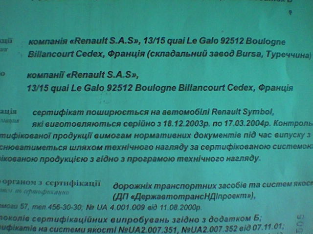 Ну, вот вроде подошли к теме разговора... Скорее всего, ДП "ДержавтотрансНДІпроект" посчитал, что турецкому цеху компании РЕНО можно дать сертификат только на 3 месяца, есть и такой опыт при нестабильном качестве поставляемых комплектующих. Изображение действительно, из рук вон плохое, (видно камера в фотоаппарате замаслилась) но из того что я увидел, что сертификат был выдан согласно технического осмотра онного сборочного цеха...