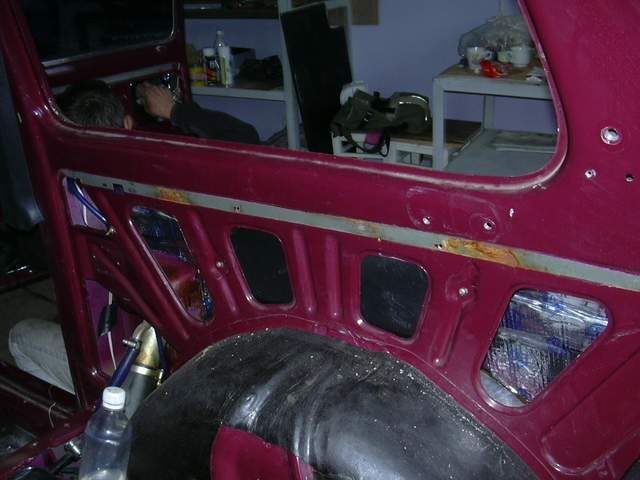 А теперь еще один хит сезона для тех кто будет делать бесшумку на Ниву(напомню - машинка 2-х летняя, а не 20-ти летняя) - сзади пластик верхним краем упирается в такую ля-ля штучку приклепаную... Приклепаную очень некачественно (звучек характерный добавляет в оркестр имени Раздатки). Решили заклепки высверлить, проложить и приклепать назад... И вот что там (кстати на передних дверях и на задней та же история):
