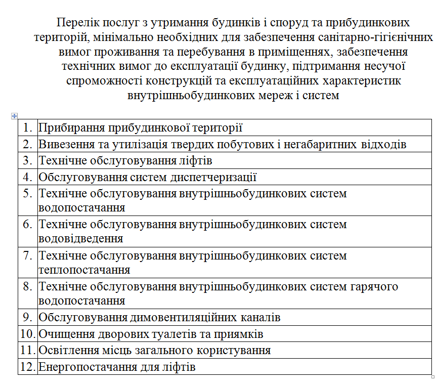 Загальний тариф 1.5539 грн Загальний тариф для першого поверху 1.5539 грн (01) Прибирання сходових кліток 0.0237 грн (02) Прибирання прибудинкової території 0.7470 грн (03) Вивезення та утилізацiя відходів 0.3023 грн (04) Прибирання підвалів та інше 0.0168 грн (07) Обслуговування внутрішньобудинкових систем 0.1692 грн (08) Дератизація 0.0038 грн (09) Дезінсекція 0.0044 грн (13) Поточний ремонт 0.0140 грн (18) Підготовка до зимового періоду 0.0018 грн (22) Освітлення місць загального користування 0.2238 грн (26) Інші витрати 0.0473 грн