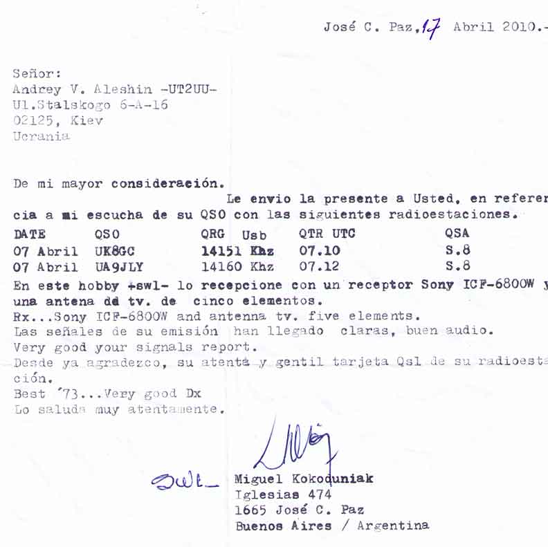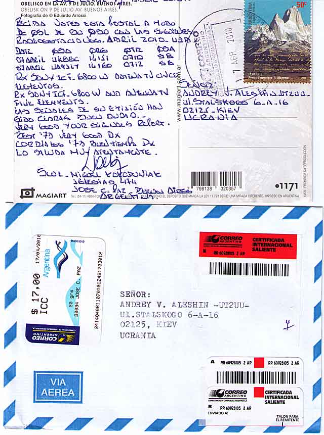 C утра в двери "стук да гром" - вам заказное письмо! Ну блин думаю, все хана - сфоткали на визирь таки ... А вот и нет - письмо с Аргентины. Столько красивых наклеечек, и судя по конверту отвалил Арентинец 17$ за него (баксы наверное какие то Аргентинские). Внутри открытка с видом на какую то площадь ихнюю. А с обратной стороны много написано и все не по нашему. Почерк тоже слабо понятный. В приложении к открытке - листик А4 с напечатанным текстом из которого я понял, что вроде как он слышал меня на какой то приемник и телевизионную антенну. Сейчас надо бы написать ответную QSL но непонятно что писать в поле TO: Позывного вроде нигде нет ... что делать не знаю - моджет имя там написать ?