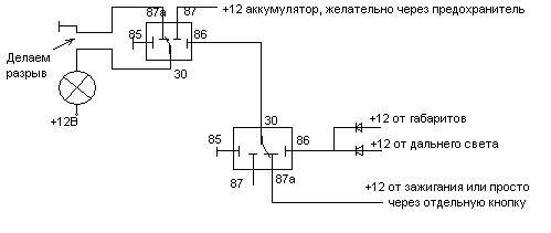 Значится так. Понадобиться два диода, два реле 5ти контатных, желательно с колодками, так удобнее будет. Ну и провода само собой разумеется. И кнопку если хош делать включение через кнопку. Делал по схеме ниже. Делается у любой из фар дальнего света(та у которй будет удобнее) обрыв провода который идет на массу. В разрыв включаем первое реле, а им управляет второе реле. Сделано на двух реле, для того что бы при выходе какого либо из них из строя все работало как в стоке, тоесть свет включался без лишних впоросов, ну или для быстрой деактивации схемы путем вытягивания второго реле из колодки. Например у меня свет включался при включении зажигания, а поскольку в машине был дистанционный запуск, то на зиму функцию дневного света отключил, что бы была меньше нагрузка на аккум в момент завода с сигналки. При желании схему можно упростить до одного реле того которое ближе к фаре. Тогда вместо +12 с аккума нужно подавать +12 которые появляются после заводки автомобиля например с генератора, и подавать на контакт 87а, а 87 бросить на массу(поменять их местами), а на 86ой контакт подавать через диоды +12 от габаритов и от дальнего света(что бы можно было мигать как штатно). Но в этом случае если реле выйдет из строя, то нужно или сразу менять или ставить перемычку что бы работал дальний свет в штатном режиме. Дерзай
