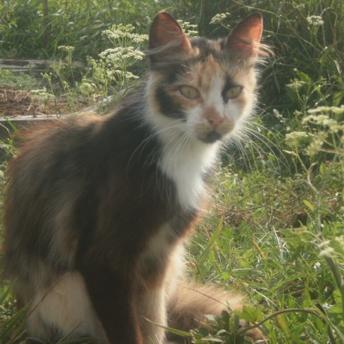 На дачу с полей пришла вот такая котятина, возраст 1-1,5. Умная, спокойная, ласковая, ненаглая девочка. Была невероятно худая. Я так понимаю вывезли в поле и выбросили.