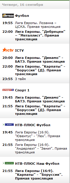 Посмотрел только что расписание сегодняшних трансляций... Не понравилось, фиговое какое-то. Динамо в прямом трансле по айситиви в 20.00. Карпаты и Металл - в записях в 22.05 по тому же айситиви и тк Футбол. Как по мне - я бы лучше клацал каналы, читал форум и наблюдал в пипах два футбика он-лайн. Да и матч Карпаты - Боруссия, как по мне - так интереснее, зачем его в запись задвигать? С правами, наверно, сложности (хотя - какие проблемы? львовяне дома играют)...