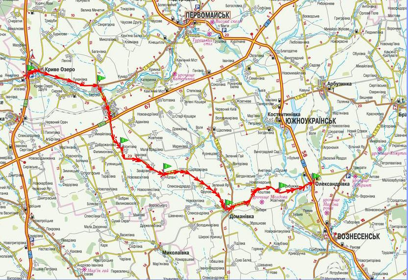 Я обещал, что отпишусь по результатам поездки по этому маршруту. Действительно, 13.08.10 я выехал из Киева в Крым в по этому маршруту. Но в Доманевке промахнулся и попал на трассу Доманевка - Николаев. Вот копия отчета. =============================================================================== В Крым планировал по маршруту Киев-Кр.Озеро - Доманевка - Александровка - Вознесенск - Н.Одесса - Николаев - Херсон - Джанкой - Феодосия. Но в Доманевке есть круговая развилка на пять направлений - и я промахнулся, так как ехал ночью за китайским грузовичком, который уверенно давил за 90 км, и в результате попал на трассу Доманевка-Николаев. Ну что сказать? Трасса средненькая, но не убитая. Везде есть вразумительные знаки, можно ехать без GPS. Видно, что местами ее поддерживают в нормальном состоянии. Есть участки, где нужно быть внимательным, гребни, разбитый асфальт. Порадовал участок от 0 до 45 км до Николаева - весьма приличная трасса, две очень широких (~3,5 метра каждая) полосы - можно ехать до 130 км. Но что особенно порадовало - так это ее низкая загруженность. И когда 24.08.10 я ехал обратно в Киев, то специально через Николаев, нашел выезд на эту трассу и назад опять поехал по ней. Вывод - можно ехать. ===================================================================================