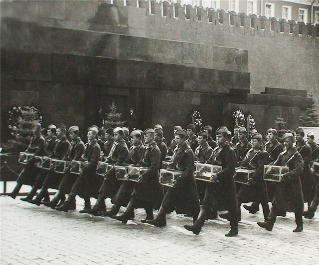 Это товарищи бойцы на репетиции строевого шага несут аквариумы)) задача - научиться вымахивать ногой так, чтоб при этом не особо расплескать воду, дабы потом "без нагрузки" красиво и торжественно пройти по площади на официозе.