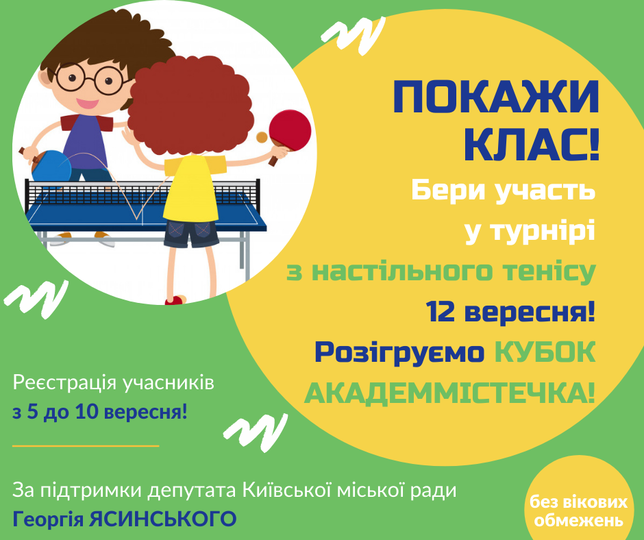 В ответ на: Друзі, запрошую вас 12 вересня до участі в аматорському турнірі з настільного тенісу! Розігруємо КУБОК АКАДЕММІСТЕЧКА! Увага: турнір не має вікових обмежень, але для неповнолітніх гравців обов'язкова присутність одного з батьків! Учасники різного віку розподіляються у відповідні групи і гратимуть на різних локаціях Академмістечка. Захід проводиться з дотриманням всіх епідеміологічних вимог: масковий режим, соціальна дистанція та забезпечення антисептичними засобами.