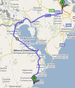 Как местный житель, советую дорогу через "молдавию", сверху лимана. Дорога нормального качества, чем дальше от Одессы, тем меньше транспорта, населенных пунктов практически нет. Вдоль Днестра дорога идет живописная. Молдавию проезжаешь транзитом. Возле Староказачьего поворот на Б-Днестровский. Дорога отличная, хороший асфальт, практически без транспорта. При въезде в Белгород пару км отвратильной дороги по улицам. (Увы, в нашем Аккермане - худшие дороги на юге Украины). И прямая дорога Белгород-Сергеевка-Курортное.