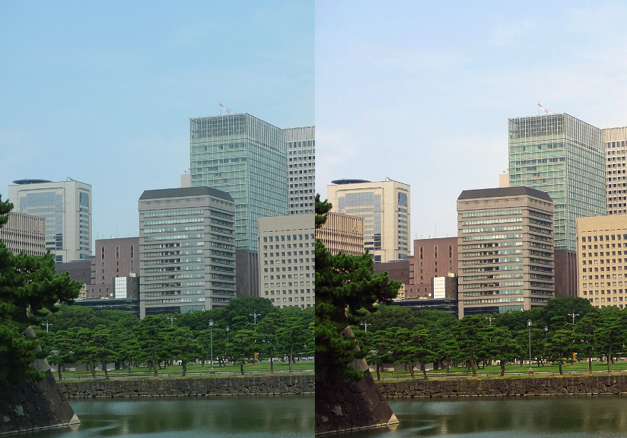 Во многих случаях несколько минут шопа на снимок позволяют много чего поправить. Если присутствует дымка, то уменьшить ее эффект можно увеличив контрастность и поправив цвет. Общий синеватый оттенок усиливает ощущение "мутности", а небольшой сдвиг к желтому подчеркивает ощущение солнечного дня. В наиболее тяжких случаях могут понадобиться слои (но это уже действительно для сильно сложных случаев), когда контрастность увеличиваешь не на всем кадре, а только в его части.