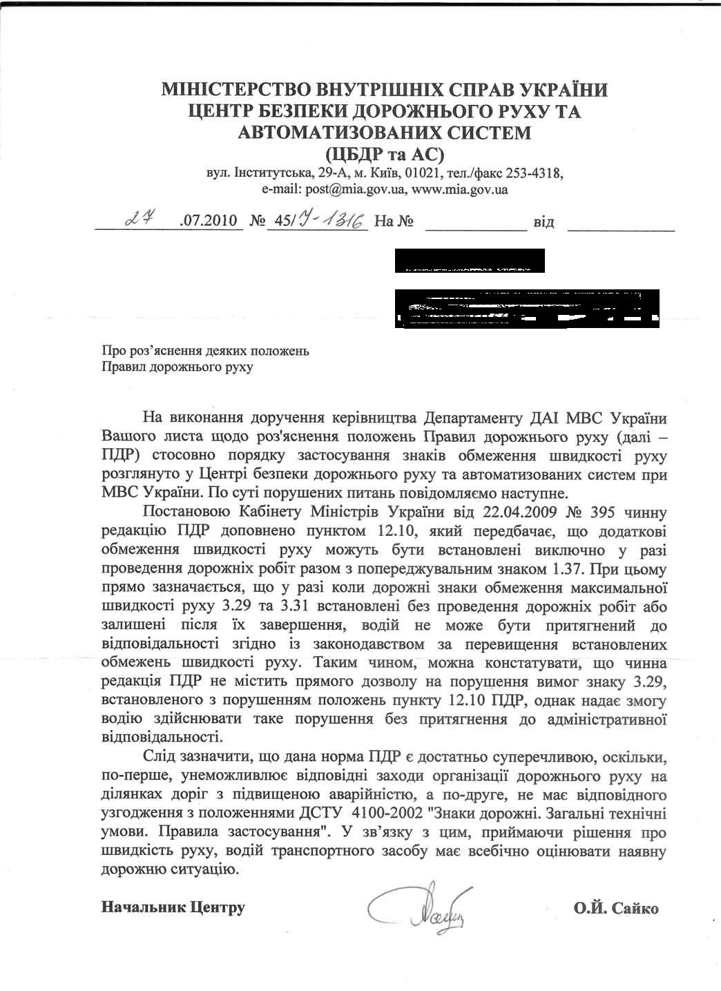 Собственно скан письма. Думаю - все понятно. Может пригодится. Сам не попадал но знаков ограничения скорости в комплекте со знаком "Прочие опасности" - видел по дороге в Крым предостаточно.