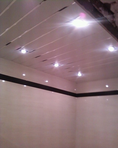 у меня влагостойкий гипсокартон, со светильничками...покрашено какой то краской, уже не помню, но типа лучше она для ванной. уже года 3 стоит. все ОК.