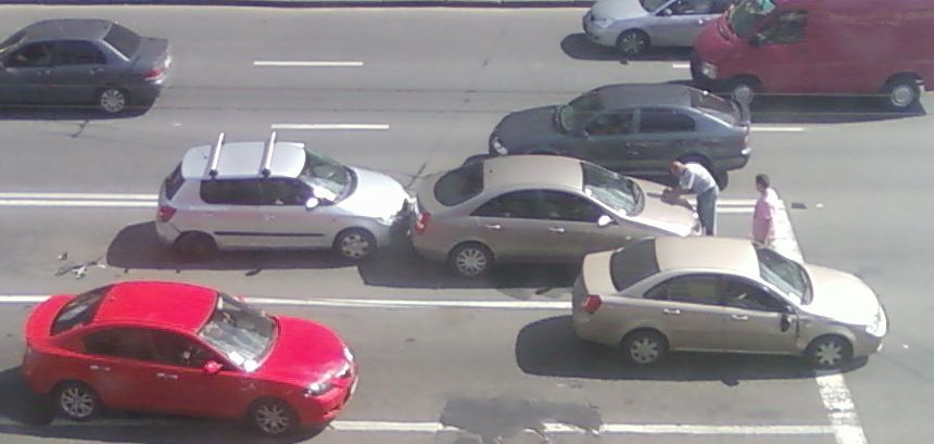 как я понял (из "картинки" + слов коллеги, наблюдавшего все вживую), бус коцнул справа лачик, тот бахнул шкоду, которая догнала ниссан У лача как минимум серьезная рихтовка дверки (+) не видел что слева делается), у ниссана вроде только бампер, у шкоді - вірвано заднее колесо...