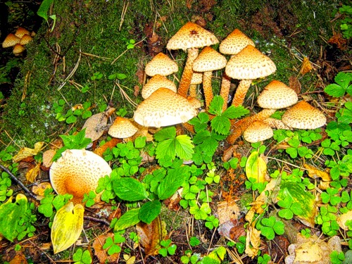 Через недельку две королевские опята должны быть, уже попадаются, сегодня набрал немножко. Был бы дождь было бы гуд, а так на лесном болоте (даж провалился почти по колено) набрали 2 корзины еще летних опят вместе с королевскими, а так по лесу аж 4 гриба нашли 2 бабки зонтик и опенок, а еще с 10-к молоденьких дождевичков, со сметаной они