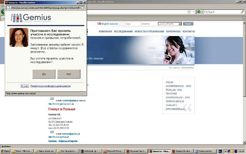 Коллеги, весьма задолбал опрос компании Гемиус по заказу Россавы... на протяжении 3-х дней и дома и на работе постоянно вылазят вот такие навязчивые предложения заполнить анкету