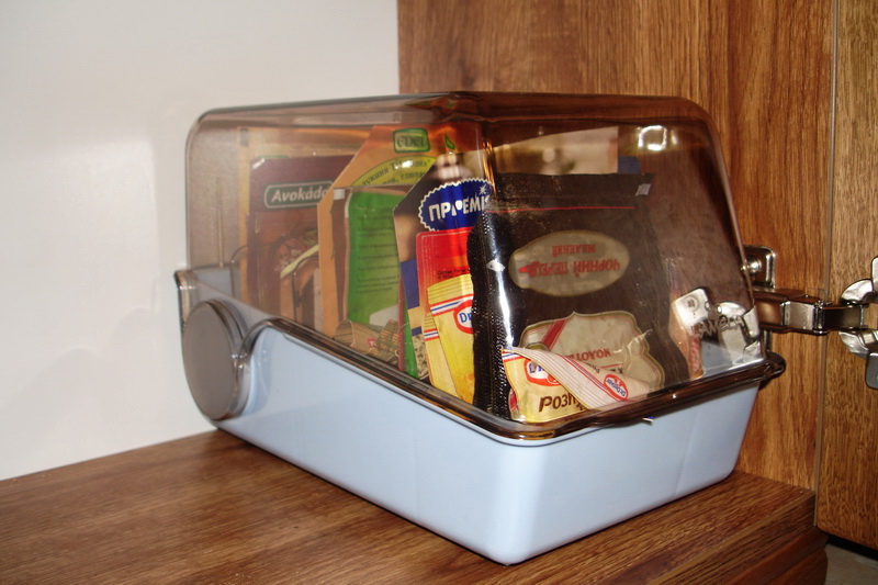 купила небольшую корзинку, там плотняком складываю открытые пакетики в стоячем положении. Другого выхода не вижу - баночки слишком много места занимают