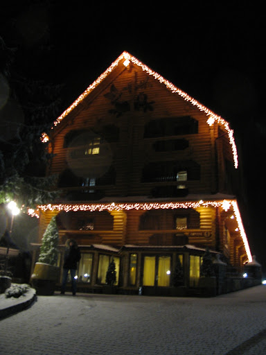 Выйдя из машины, мы были шокированы тишиной. Т.е. слышен шум р. Черемош, мычание коров, но это была Тишина. Просто другая реальность. Цивилизация не здесь, она осталась где-то там, где асфальт. Очень классное ощущение. Кстати, и мобильные (МТС) не везде работали. На территории отеля искали островки, откуда можно позвонить. Впервые нас встречали у порога отеля «хлебом-солью», т.е. местным первачом (ничего так, нормальный ;-) водой для ребенка и незамысловатой закусью. Наверное, чтобы уже не уехали ;-) В отеле мы были одни. Еду заказали за час-два до ужина, чтобы повар все успел купить и приготовить. Так сказать, с колес приготовление, но зато свежее. Еда вкусная, цены средние. Пару слов об отеле. Открылся перед Новым 2010 годом и кое-где в мелочах еще не все сделано (например, нет локального освещения в ванной), но в целом нам понравился. Т.к. место в глуши и обслуживание еще не поставлено на «поток», чувствуется внимание со стороны персонала. Удачи, ребята, так держать. Рекомендуем для тех, кто хочет отдохнуть в тишине вдали от суеты (отель в селе в 3 км от дороги) Семейный полулюкс обошелся в 300 грн/сутки.