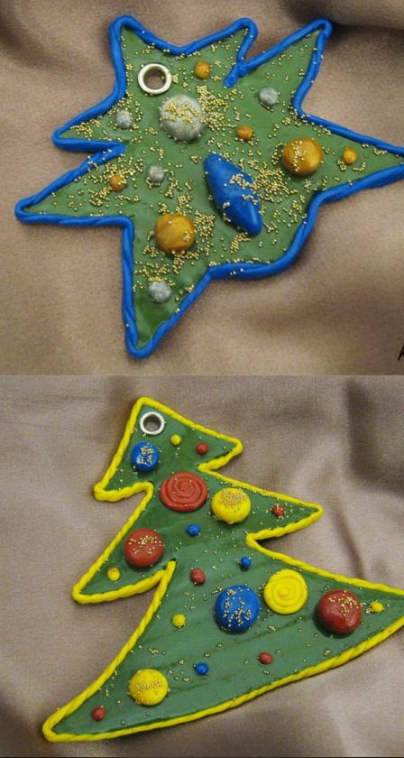 Вчера купила пару наборо игрушек типа таких: На удивление не дорогие(сравнительно)маленький набор 36 грн, большой 76грн Ps Детям среднего возраста можно предложить сделать игрушки на елку самим(мои очень любили когда на елке красовалась их собственная игрушка))) Для этого нужен толстый картон(коробка из-под чего-либо), ткань зеленого цвета(или цветная бумага), пуговицы, бусинки и бусины, блестки, нить, пластелин или керамический пластик. Немного фантазии, терпения и время