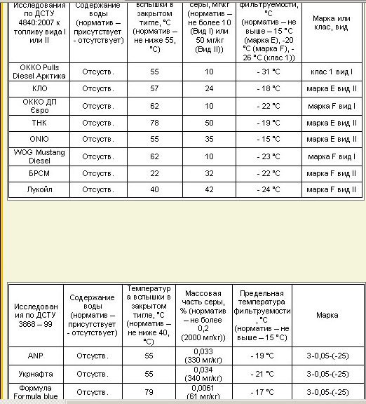 Последнее исследование дизельного топлива Институт потребительских экспертиз проводил ровно год назад. А «взяться за канистры» и провести новый рейд экспертов вновь побудило наступление морозов, которые, как предрекают синоптики, скоро станут совсем «лютыми». Готовы ли наши продавцы «солярки» к такому повороту дел? Сегодня АЗС рекламируют даже «арктическое» дизельное топливо, которое выдерживает очень низкие температуры. Это очень важная характеристика, так как известно, что дизельное топливо имеет свойство загустевать при низких температурах, последствия чего уже могут ощутить на себе владельцы дизельных машин, которые имели неосторожность заправить не качественное топливо. Прошлогоднее исследование дизельных топлив показало сравнительно неплохие показатели, причём это касалось как импортного топлива, так и продукции украинских предприятий. В этот раз эксперты также решили провести комбинированную проверку - в аккредитованную лабораторию отправились дизельное топливо марки ДП ЕВРО (как было указано на стелах), «солярка» без приставки «евро» и «именные» образцы. Конкретнее, эксперты приобрели образцы «обычного» дизельного топлива с АЗС ТНК, ANP, КЛО, Укрнафта, образец с приставкой «ЄВРО» с АЗС ОККО и Лукойл, киевских сетей БРСМ и ONIO. «Именных» представляли новые продукты WOG - ДП Mustang и ОККО Pulls Diesel Арктика, компанию которым составила давно известная Formula blue сети Formula. Исследования проводились по разным методикам - «евродизель» и «именные» образцы проверяли на соответствие нормам нового ДСТУ 4840:2007 к топливу видов I и II, а «просто солярку» - по старому ДСТУ 3868 - 99. Самое главное различие между ними - содержание серы в топливе. Если для обычного дизтоплива по ДСТУ 3868 - 99 допускается до 2000 мг/кг (0,2%), то в ДСТУ 4840:2007 к топливу видов II (ЕВРО 4) - не более 50 мг/кг (0,005%), а для ДСТУ 4840:2007 к топливу видов I (ЕВРО 5) - и вовсе не более 10 мг/кг (0,001%). Что называется, ощутите разницу. А ведь высокое содержание серы в топливе это не только колоссальный удар по экологии, но и по двигателю. Из-за серы увеличивается износ деталей двигателя, сокращается срок службы масла, ускоряется выход из строя деталей, ответственных за выброс вредных веществ (лямбда-зонды, нейтрализаторы). Кроме того, согласно ДСТУ 4840:2007 дизельные топлива в зависимости от условий эксплуатации разделяются на марки и классы. Дизельное топливо для эксплуатации в условиях умеренного климата разделяют на 6 марок, которые отличаются предельной температурой фильтруемости (самая низкая при которой ДП ещё нормально протекает через топливный фильтр). Для зимнего периода предусмотрены две марки ДП ЕВРО: марка Е - предельная температура фильтруемости -15 градусов по Цельсию, марка F - предельная температура фильтруемости -20 градусов по Цельсию. Новым ДСТУ также предусмотрены требования для ДП предназначенного для эксплуатации в условиях арктического климата. В этом случае ДП ЕВРО делят на классы: класс 0 - предельная температура фильтруемости -20 градусов по Цельсию; класс 1 - предельная температура фильтруемости -26 градусов по Цельсию. Кроме содержания серы, образцы были проверены по таким параметрам, как содержание воды, температура вспышки в закрытом тигле и предельная температура фильтруемости. Сразу отметим, что результаты оказались намного лучше ожидаемых. Только две пробы не уложились 