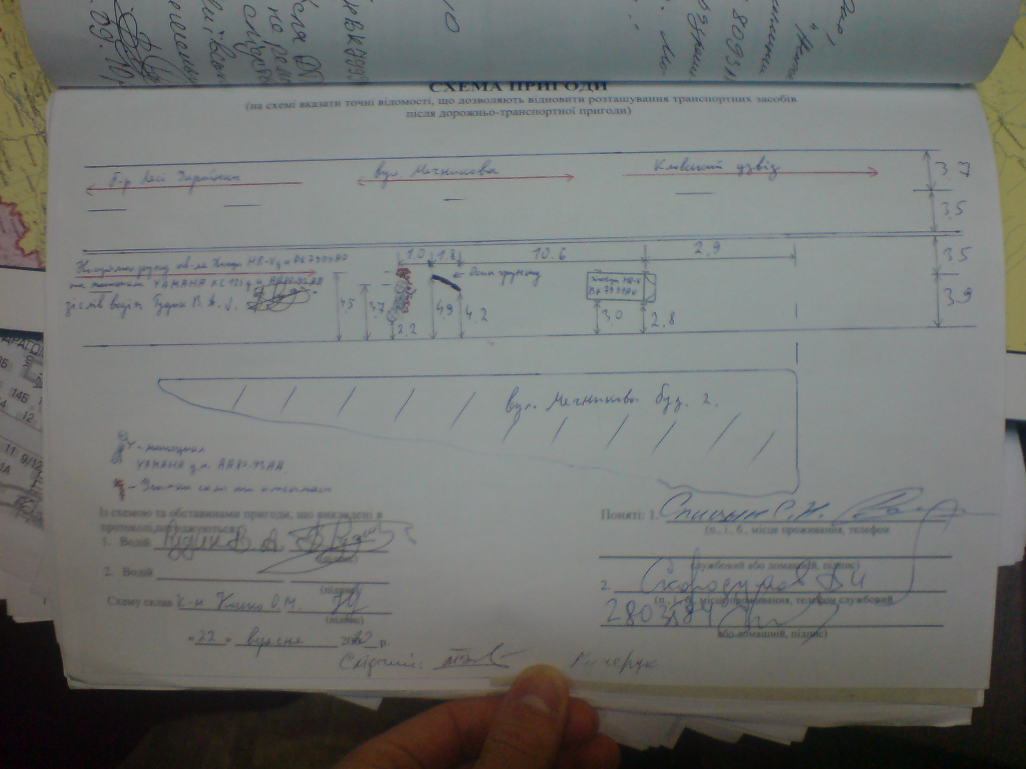 1) Объяснения мои ... Ехал 55 км. в направления ул.первомайського и увидел как резко со встречной полосы водитель хонды начинает маневр разворот, и таким образом он оказался за метр от меня и я совершил наезд на переднее правое крыло, (после чего задняя часть скутера поднялась и упала на дорогу так,как изображено на схеме ментов). тормозного пути не было, (так как там были сотая секунды на мой взгляд). не было возможности уйти в право, так как с 2х сторон дороги в первые полосе были запаркованы автомобилями , оставалость только 2 свободных, а именно моя 2я и встречная 2я полоса которие полностью перекрыл автомобиль хонда. После столкновения было коротко временная потеря сознания .Ощутил боль в области колен. Так как автомобиль перегородил полностью движения, Кто то из прохожих крикнул водителю хонды убрать автомобиль "Убери автомобиль чтоб люди могли ехать тут и так много свидетелей"после чего водитель хонды немного здал назад, а потом проехал вперед на 10 метров. После чего меня забрала КШД. (скорая)