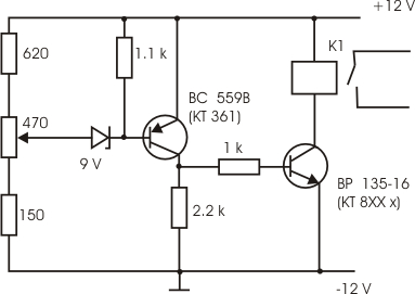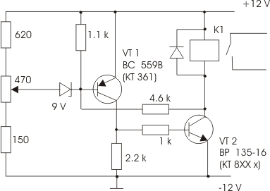 По-перше: воткни диод какой-нибудь параллельно обмотке реле (катодом на +питания), бо сгорит транзюк, релюху включающий - не сразу, так очень скоро. По-друге: при напругах, близких к пороговым любая подобная схема работает в активном режиме и чем меньше ее усиление, тем ширшэ этот диапазон. Короче, говоря совсем простым языком тебе нужно ввести ПОС в виде резюка между базой первого и коллектором второго транзюка килоом на несколько или несколько десятков. А сопротивление сего резюка будет определять величину гистерезиса при переключении. Я б целился в 3-4 десятых вольта. Нужно точнее - ставь компаратор с опорой, а с транзюка и стабилитрона точности