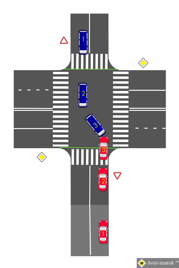 По поводу перекрестка из стартового сообщеня я не спорю. Исходя из наших ПДД у меня там ум за разум заходит. Я больше имел в виду свою картинку. Вот я немного изменил ситуацию. Три стадии развития событий 1,2 и 3. В первой обе машины на второстепенной едут, допустим 40-50 км/ч. Во второй - синяя УЖЕ на главной (по твоей трактовке), а красная только собирается пересекать границу. Ну а в третьей синяя резко сворачивает налево и сталкивается с красной. Синий нарушил пункт о пропуске встречных при повороте налево. НО! Приехавшим гаишникам он заявляет, что не виноват, т.к. был на главной! (момент 2), и красный должен был ему уступить "независимо от дальнейшего направления движения". А если учесть, что при таком ДТП синий почти всегда оказывается на перекрестке раньше красного (ему надо проехать большее расстояние до точки столкновения), то у меня рушится вся привычная схема проезда перекрестков.