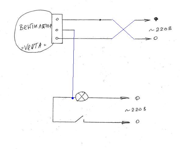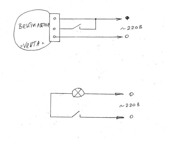 Если сделать правильно, во втором рисунке нужно поменять местами фазу и ноль. Тогда подключаем так: ноли соединяем, фазу вентилятора берем на входе выключателя, управляющий сигнал на вентилятор берем на выходе выключателя.